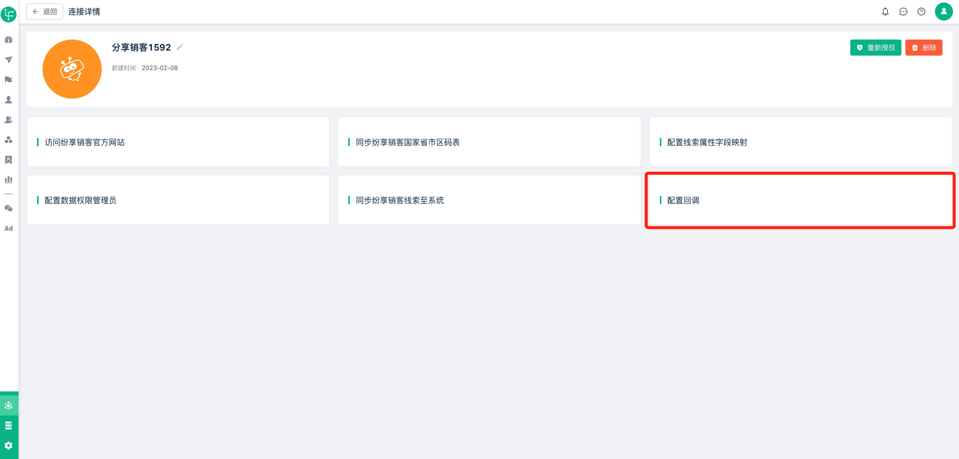 1、打开纷享销客“连接详情”页面,找到“配置回调”,如下图: