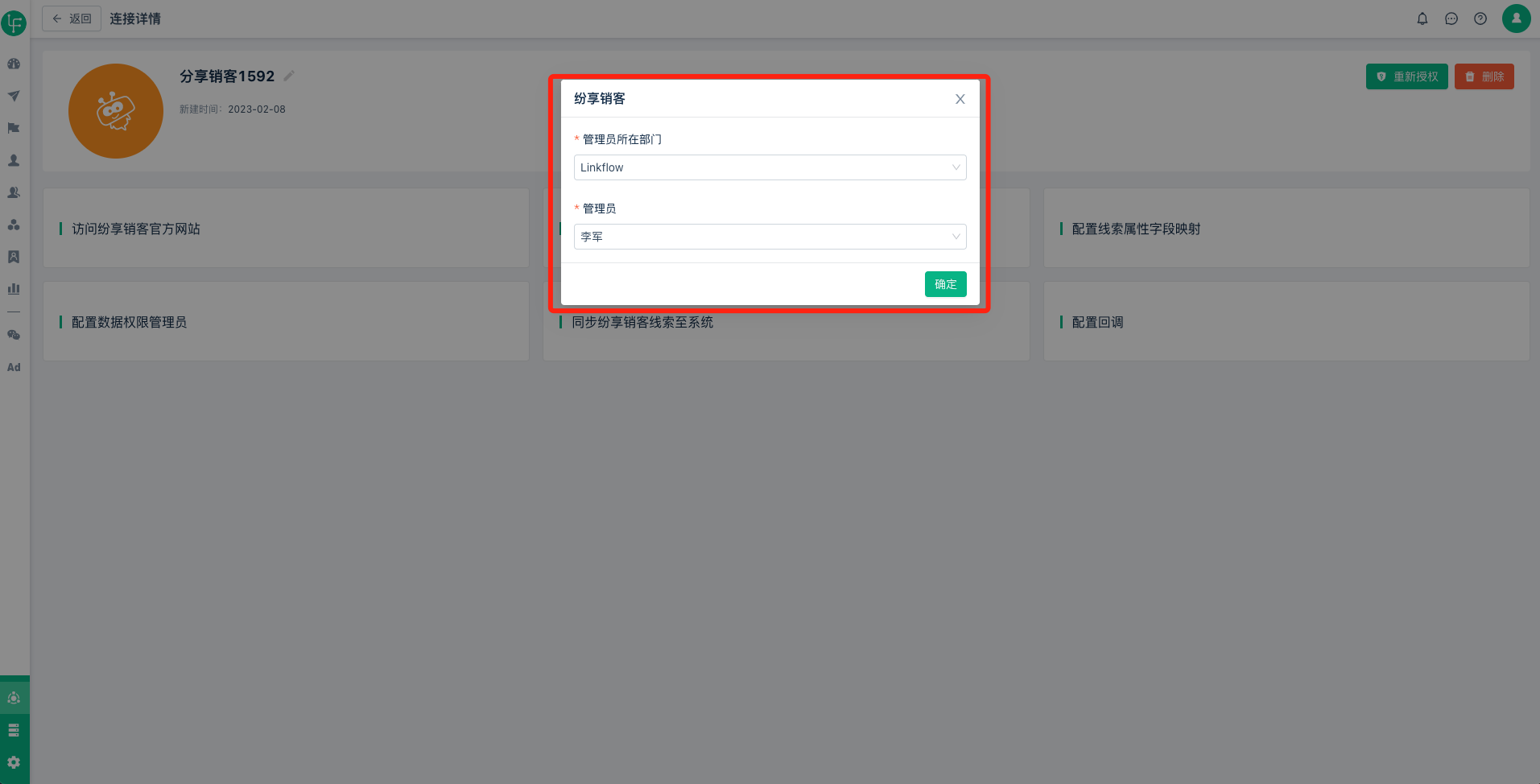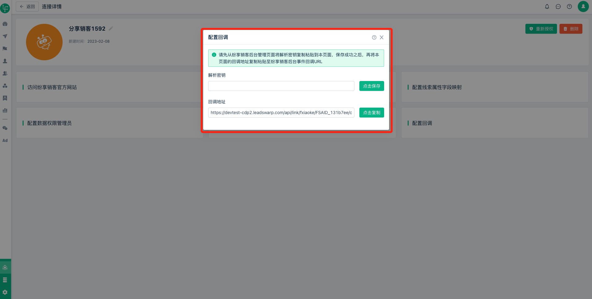 - 必须是选择有数据权限的管理员,否则会导致后续历史线索数据以及增量线索数据同步失败
