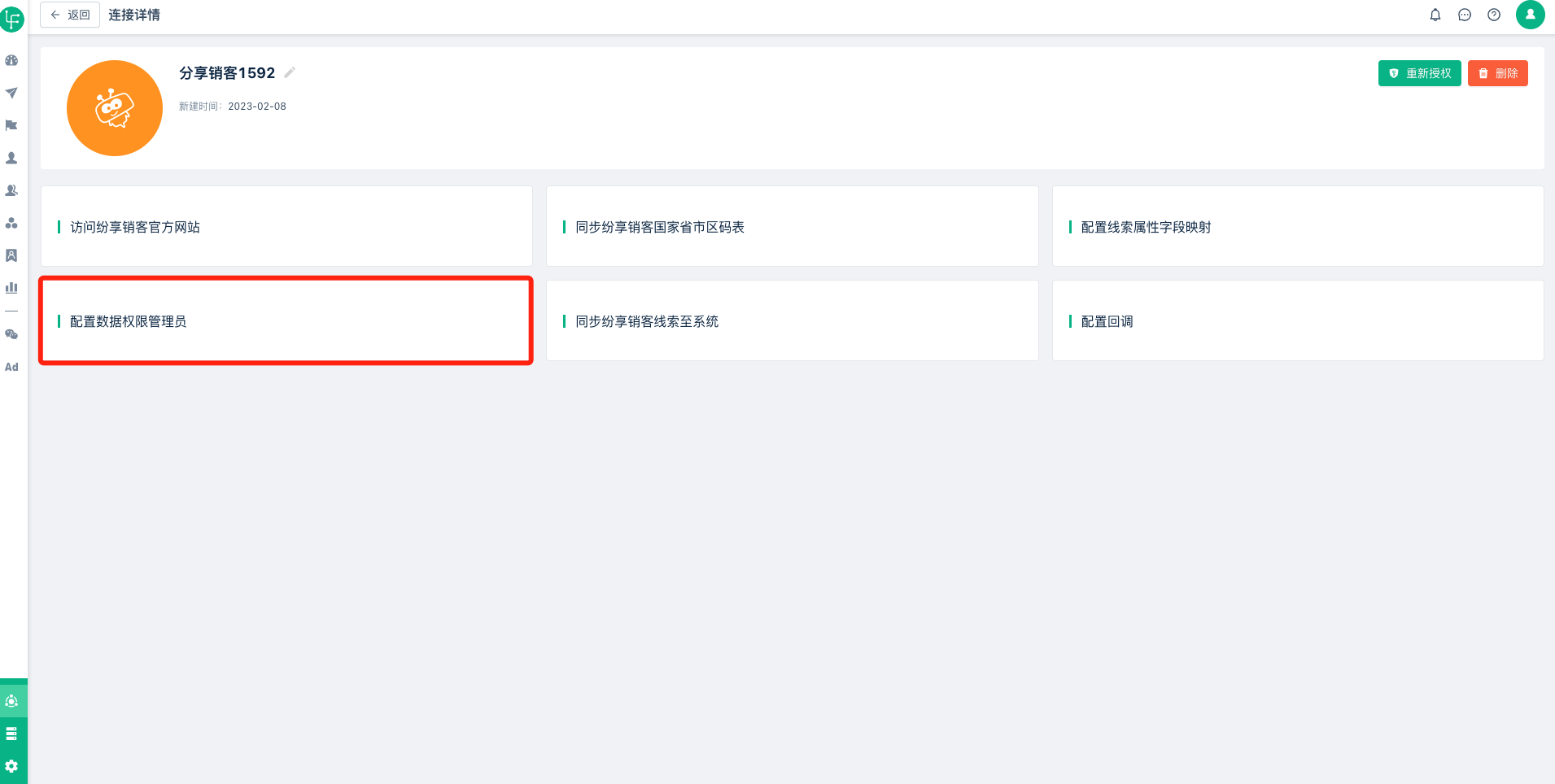 1、打开纷享销客“连接详情”页面,找到“配置数据权限管理员”,如下图: