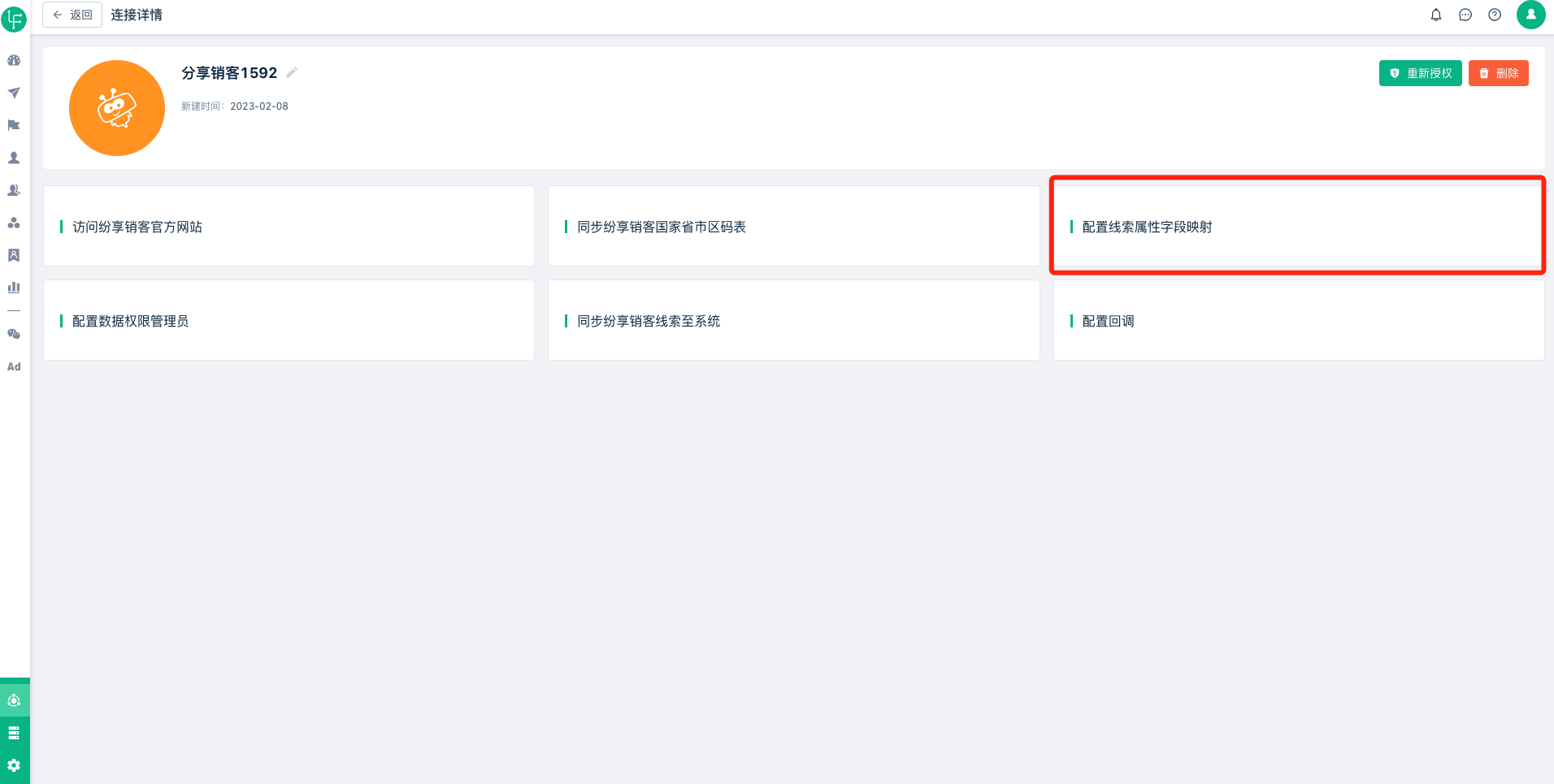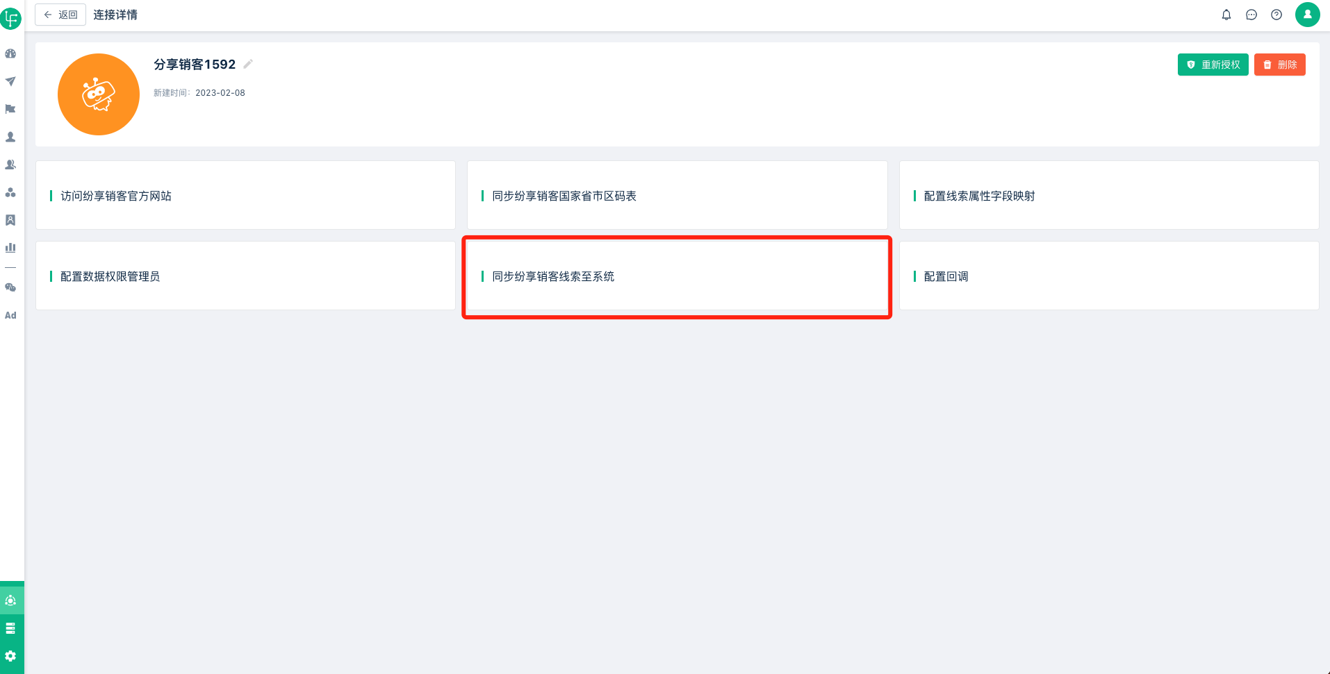 1、打开纷享销客“连接详情”页面,找到“同步纷享销客线索至系统”,如下图: