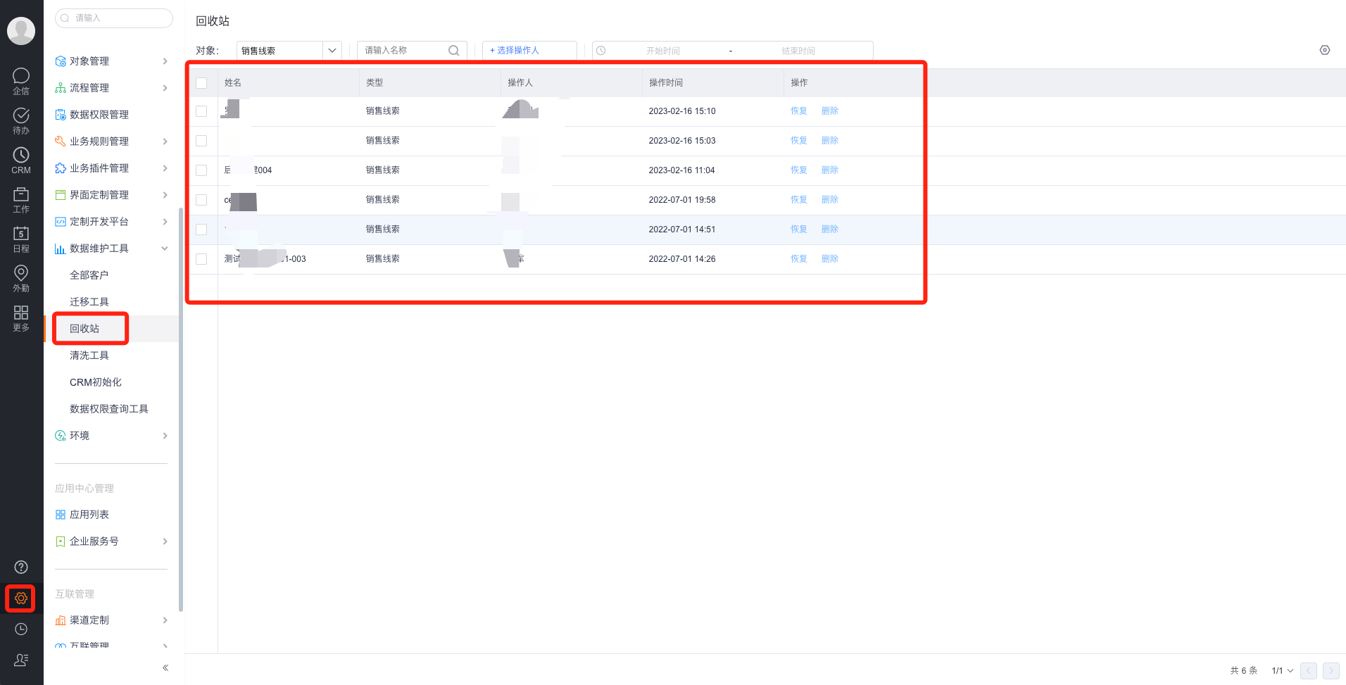原因:纷享销客端被删除了的线索数据是不显示在页面上的, 但是这些线索数据还存在数据库中,可以在系统的回收站中找到被删除的那部分线索数据,即可对上。如下图